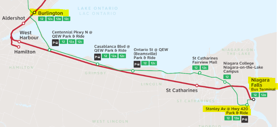 Burlington GO에서 12B번 또는 12번 버스를 타면 Niagara Falls Bus Terminal까지 갑니다.