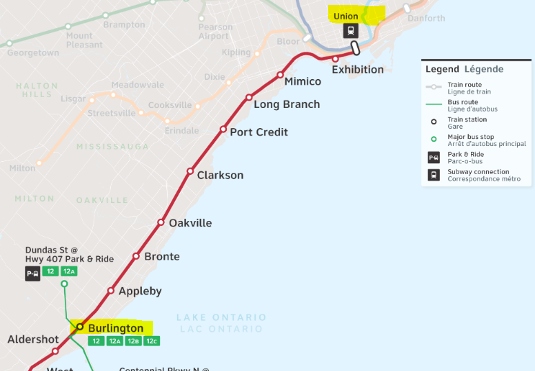 토론토 유니온역에서 GO 트레인을 타고 Burlington GO 역까지 이동합니다. (약 1시간 소요)